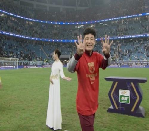 不过,武磊很快调整了自己的情绪。在颁奖礼上,面对镜头,武磊激动的伸出四根手指,示意自己第4次拿到了中超冠军。而在与王燊超一起举起奖杯时,武磊还复刻了梅西世界杯夺冠之后的动作。