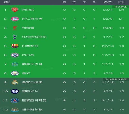 而在最后一轮所有比赛全部结束后,阿森纳和拜仁仍然排名前二,但后面的名次发生了非常大的变化,利物浦和热刺均上升一位,排名第三、第四,巴萨从第九升至第五,切尔西升至第六,葡萄牙体育从第十升至第七,而曼城从第十一升至第八;原本在第七轮排名第三的皇马最后一轮2-4不敌本菲卡,掉至第九,巴黎和纽卡本轮战平,也纷纷掉出前八,这三支球队将会征战附加赛。